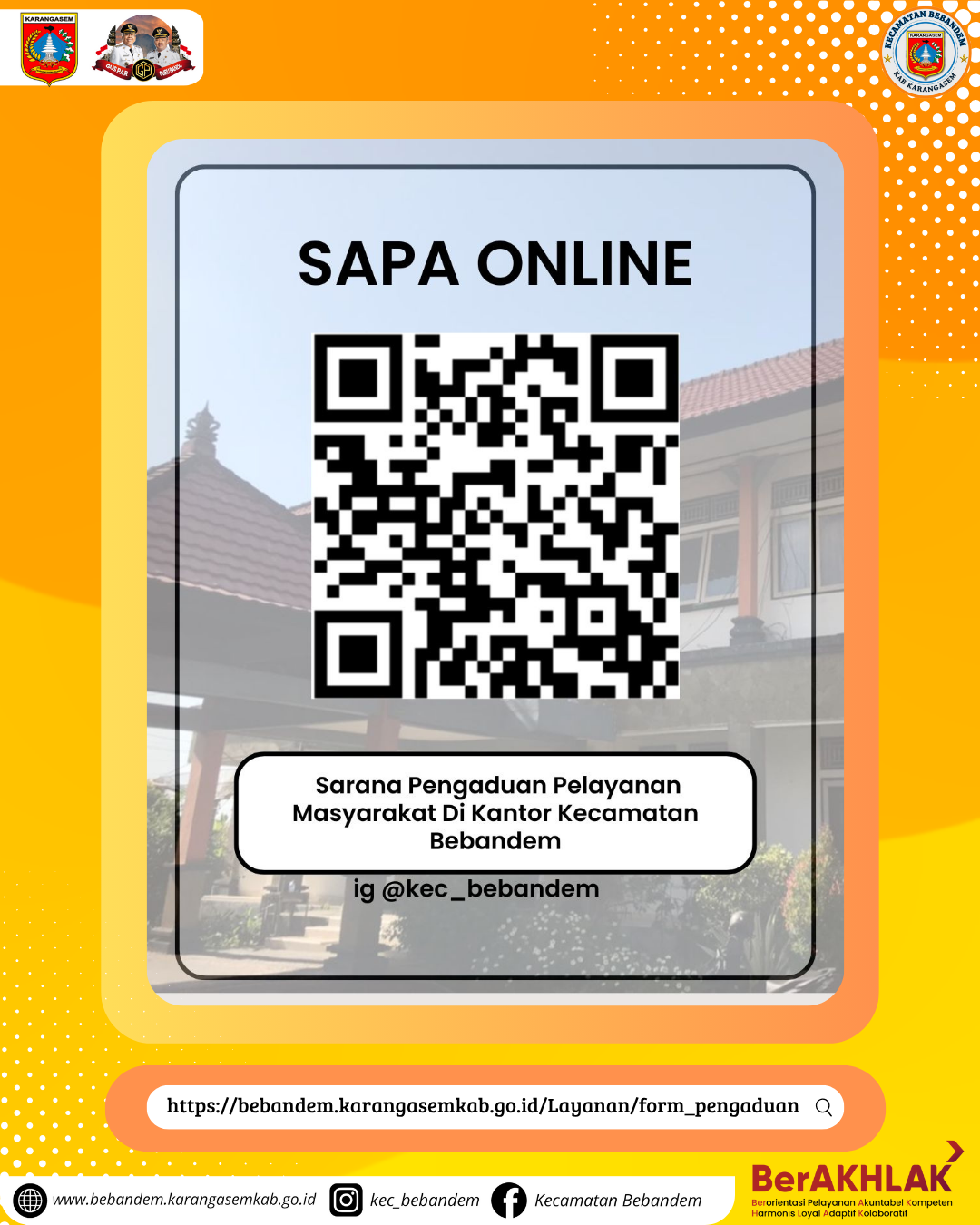 Dalam upaya meningkatkan kualitas pelayanan kepada masyarakat, Kecamatan Bebandem kini menyediakan Sarana Pengaduan Pelayanan Masyarakat (SAPA Online). Melalui laya ... Lihat Selengkapnya
